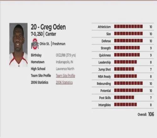 美国NBA DRAFT网站给他综合评定106分的网站历史第一高分, 后来的蔡-威廉森是100分,文班亚马是101分,奥登在强壮度、尺寸、防守、篮板、潜力方面都是满分,唯一不足的就是跳投和篮下低位技术,选秀模板设定为海军上将大卫-罗宾逊和指环王比尔拉塞尔这种NBA传奇。